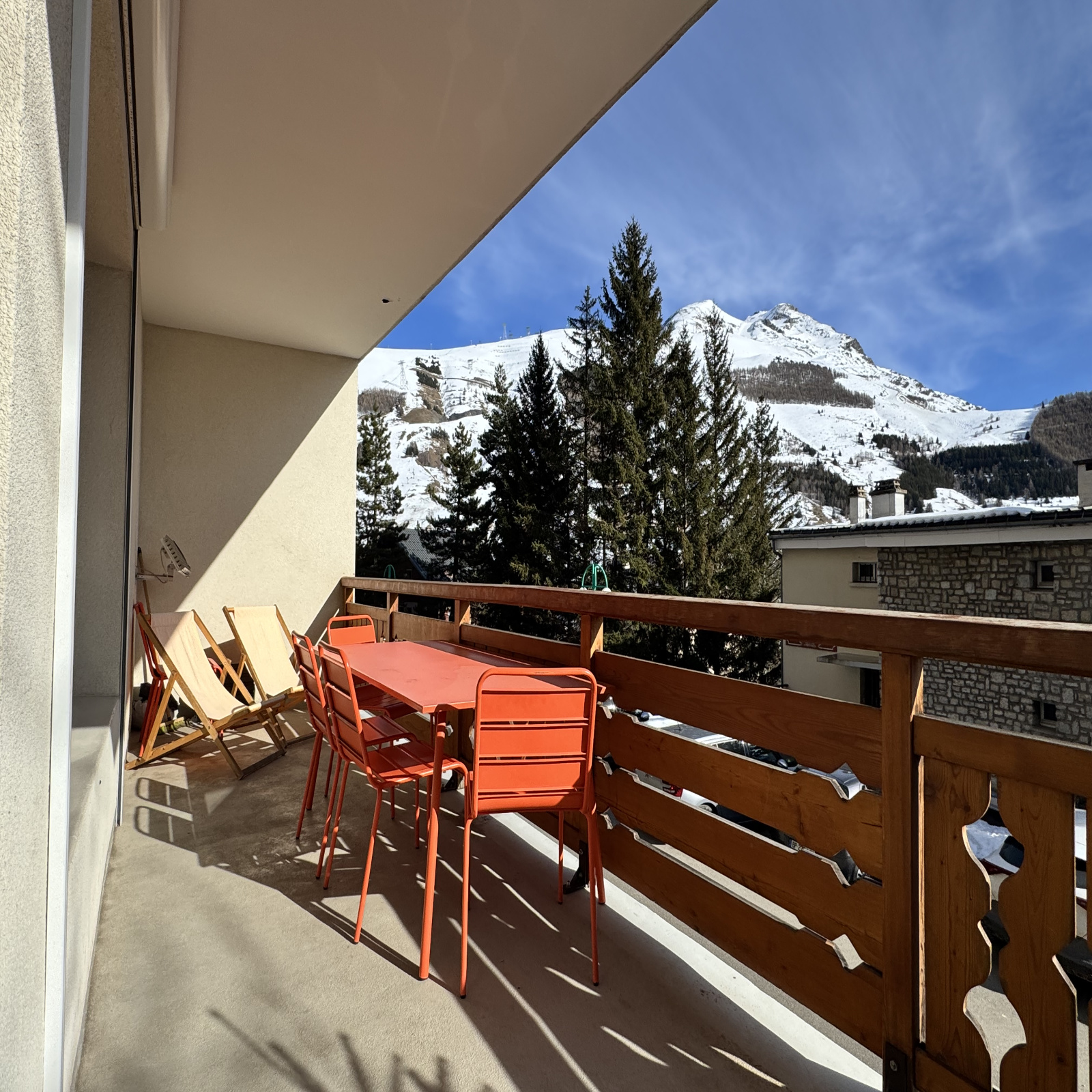 La pièce à vivre, spacieuse et entourée de larges baies vitrées, profite d’une exposition idéale, allant du sud-est au sud-ouest, garantissant un ensoleillement optimal tout au long de la journée. De cet espace de vie chaleureux, vous accédez à une terrasse d’angle de plus de 25 m², véritable havre de paix. Imaginez-vous partageant un repas en famille, savourant un verre de vin chaud ou simplement profitant du panorama exceptionnel sur le glacier de la Muzelle, les pistes et l’ensemble de la station.