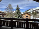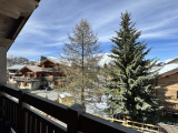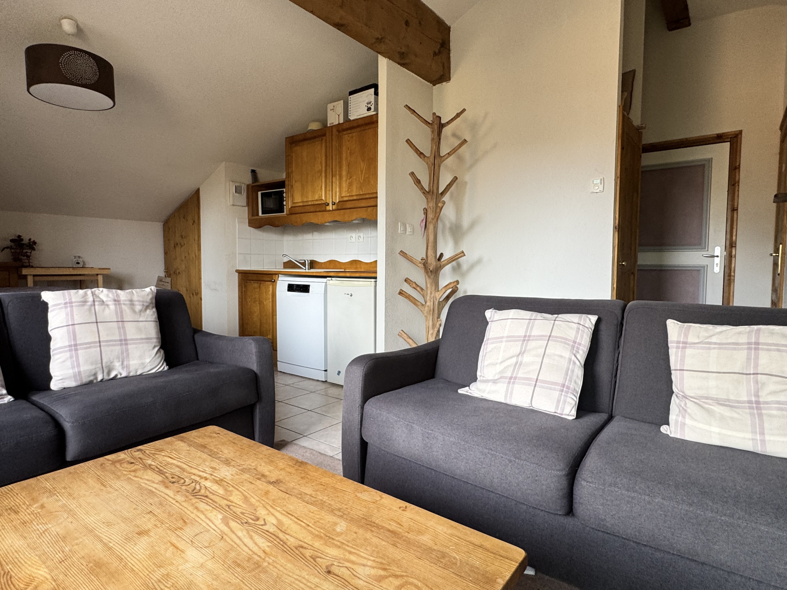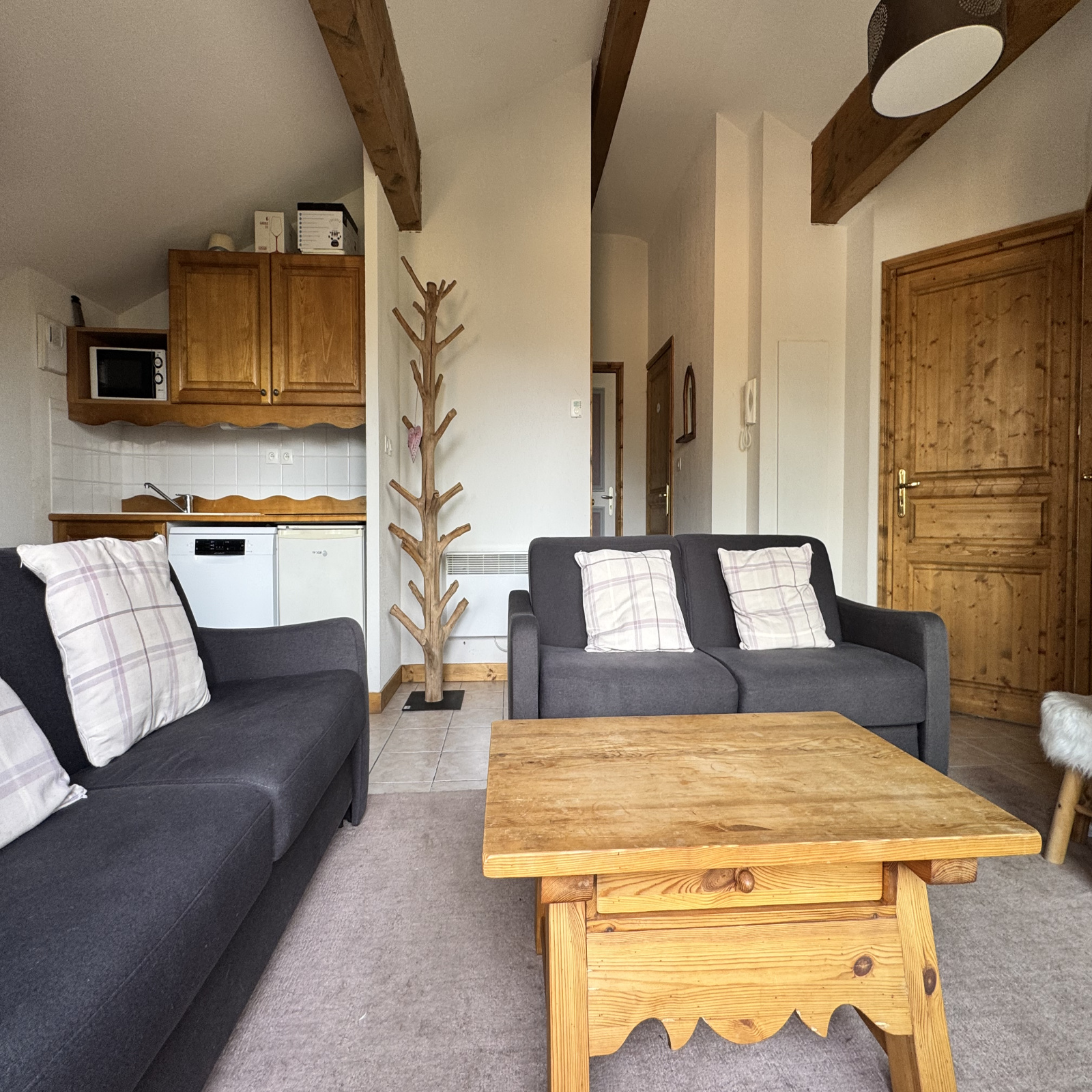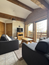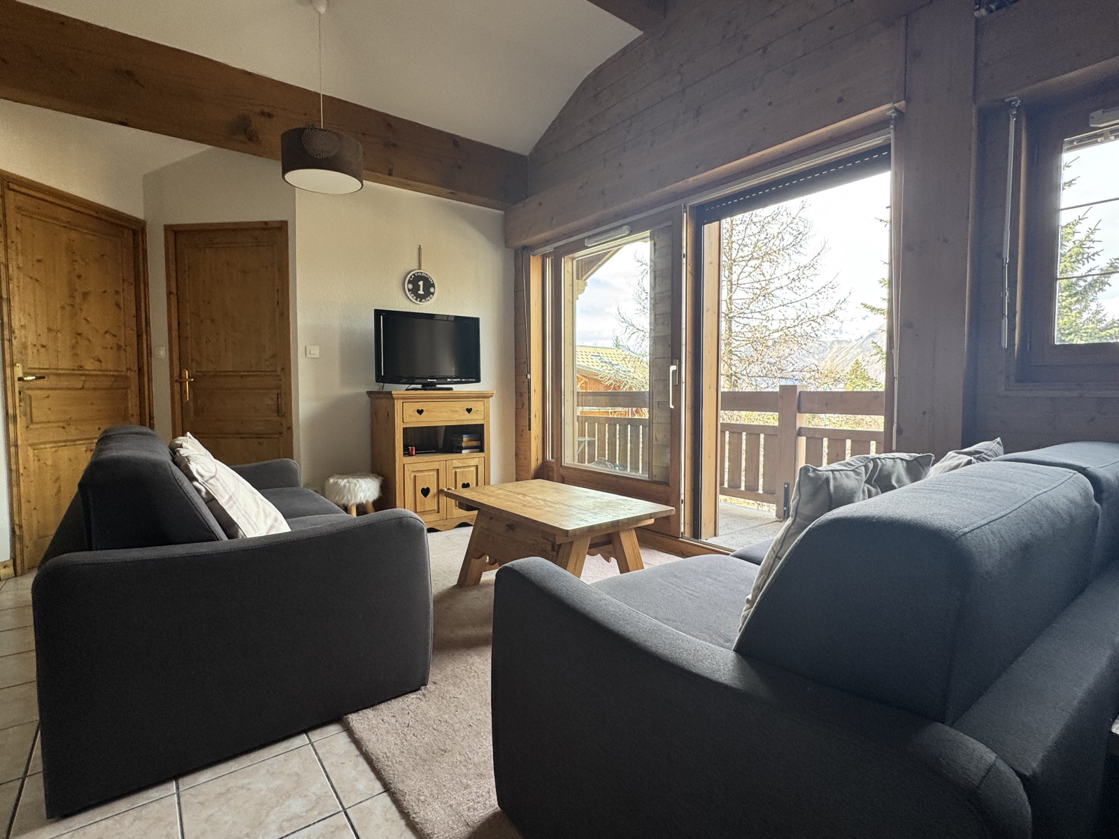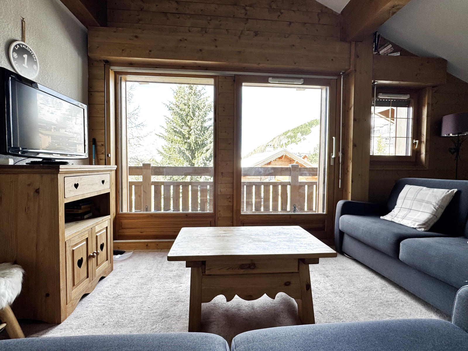 Sous les toits, avec une hauteur sous plafond allant jusqu’à 3 mètres, l’appartement dispose d’une pièce de vie lumineuse avec une grande baie vitrée ouvrant sur un balcon offrant une vue imprenable sur les montagnes.