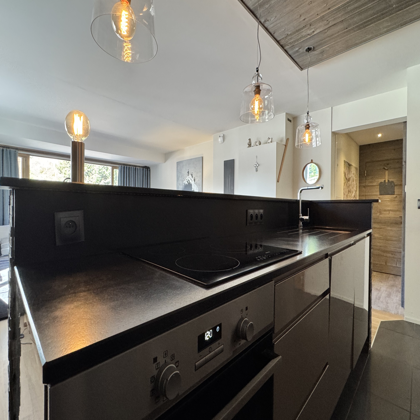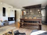 Le séjour de 38 m², rare aux Deux-Alpes, est le cœur chaleureux de l’appartement, sublimé par une cheminée à bois qui promet de belles soirées d’hiver.