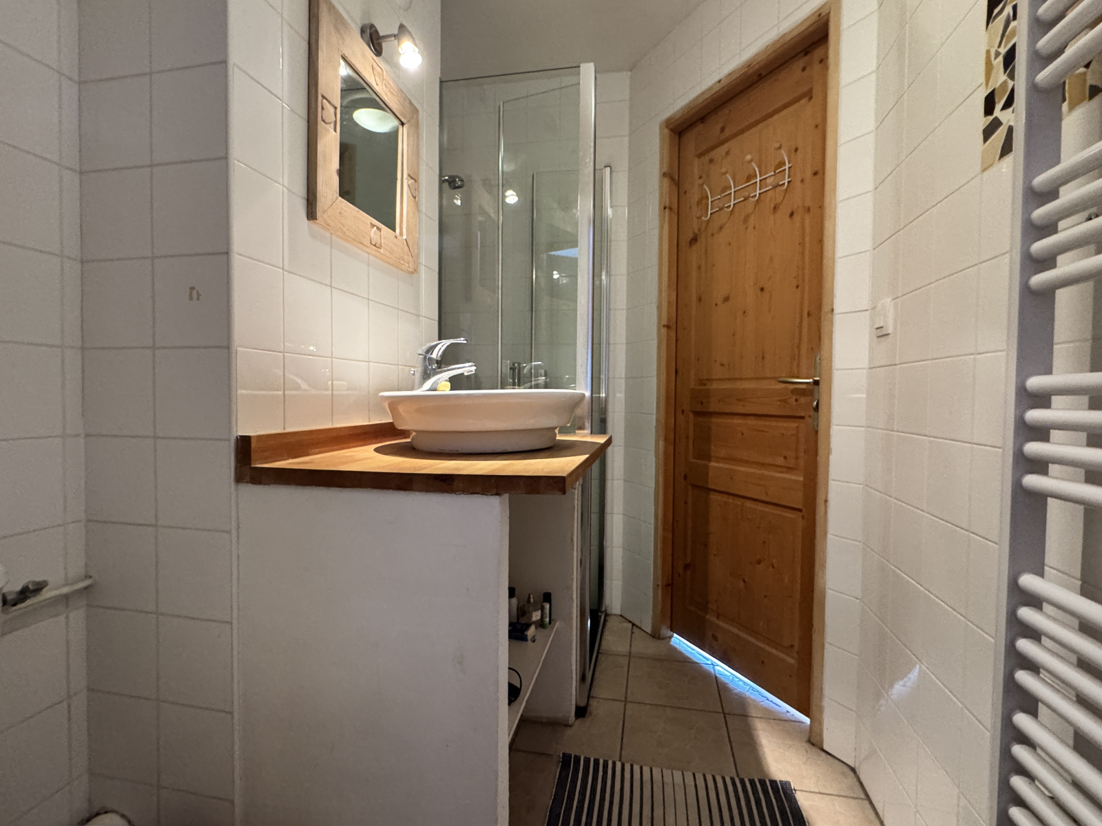 Une fois la porte franchie, le charme opère. La pièce de vie, baignée de lumière grâce à sa double exposition sud et nord, dévoile de beaux volumes et une agréable hauteur sous plafond habillée de bois.