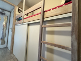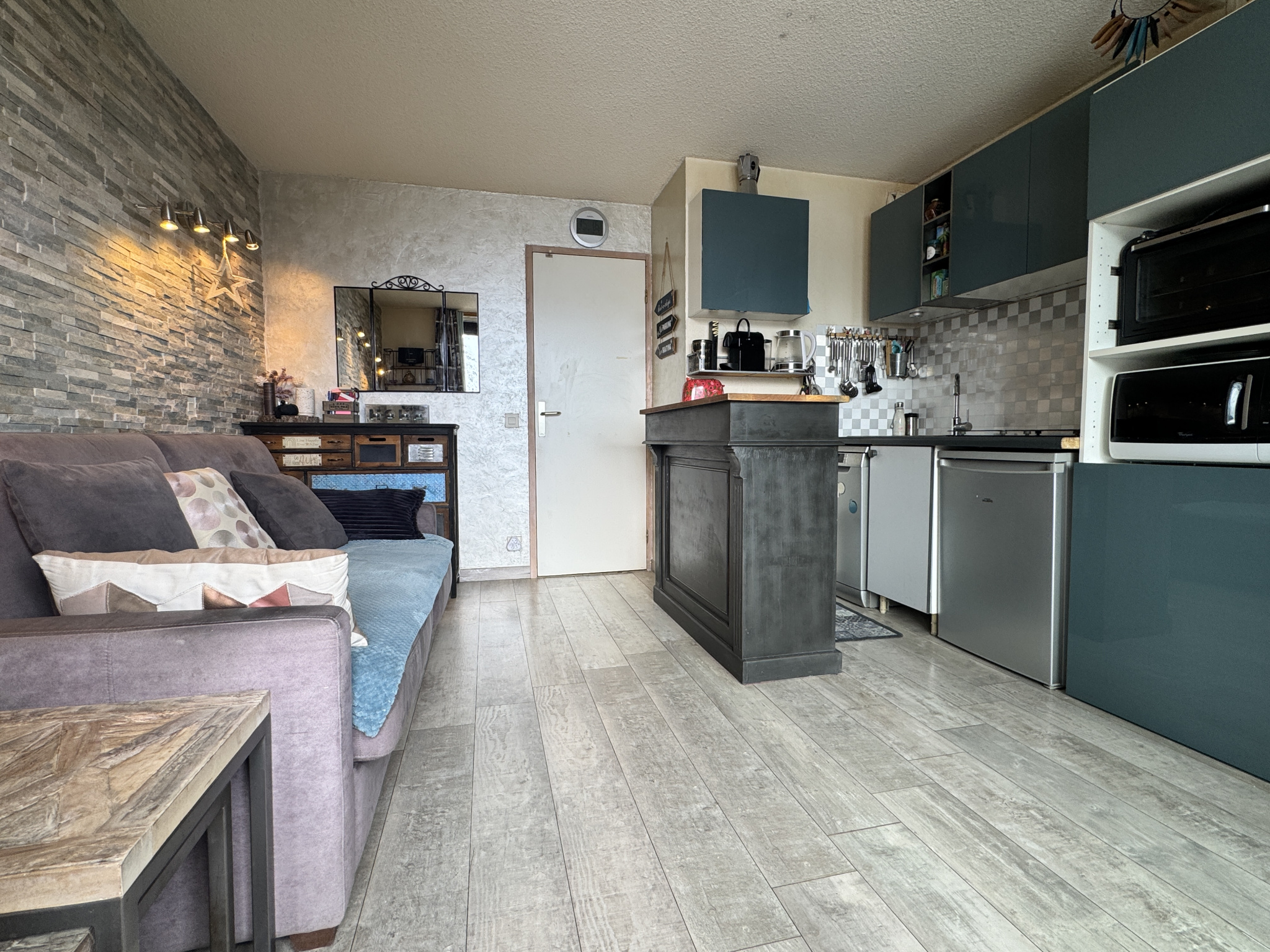 Il propose une véritable chambre indépendante avec rangements, une entrée permettant aujourd’hui d’accueillir un lit simple mais qui pourrait aisément être repensée avec des lits superposés pour optimiser le couchage, des WC séparés de la salle de bains, ainsi qu’une pièce de vie lumineuse ouverte par une large baie vitrée sur un balcon exposé sud-ouest.