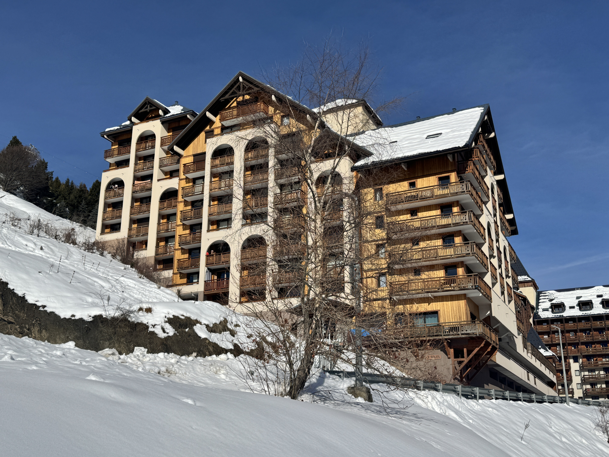 La résidence profite d’un emplacement pratique avec un arrêt de navette au pied de l’immeuble et le domaine skiable est accessible par la télécabine de Super-Venosc.