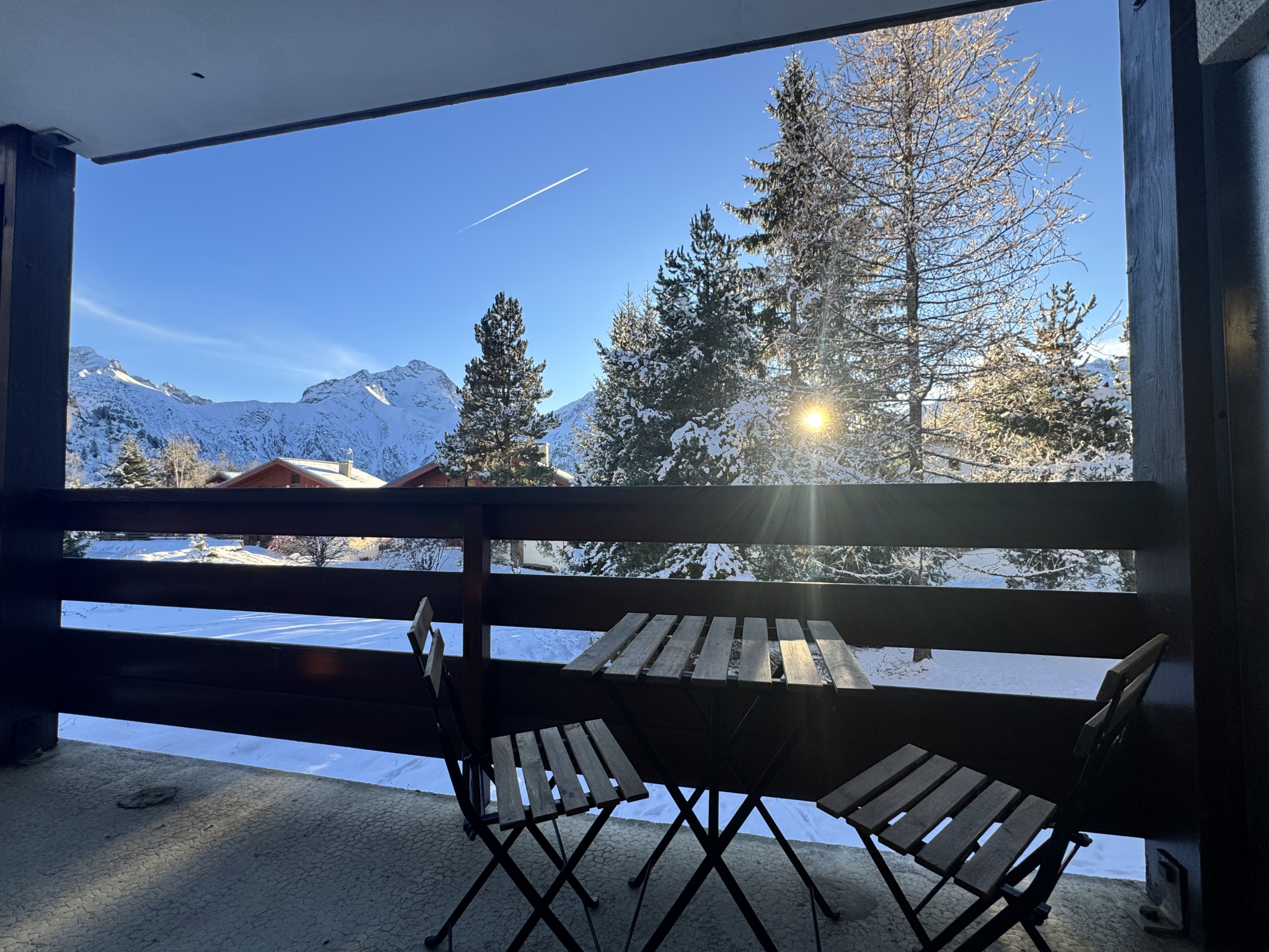 En ouvrant la baie vitrée, on découvre le balcon baigné de soleil l’après-midi, la vue dégagée sur la montagne et les parapentes qui colorent le ciel.