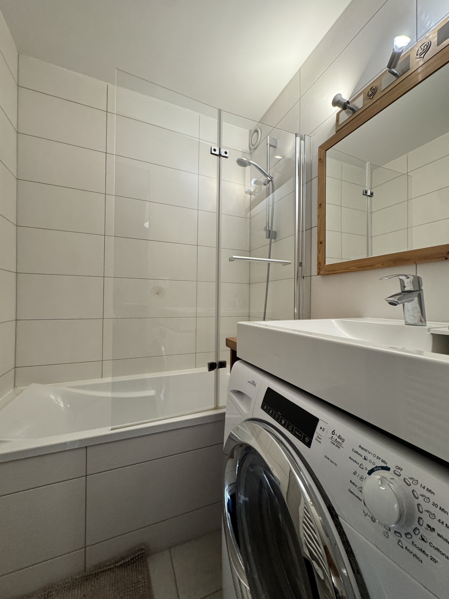 Salle de bain récente avec lave-linge, WC séparé, rangements astucieux, casier à ski et stationnement privatif pour la copropriété complètent l’ensemble.