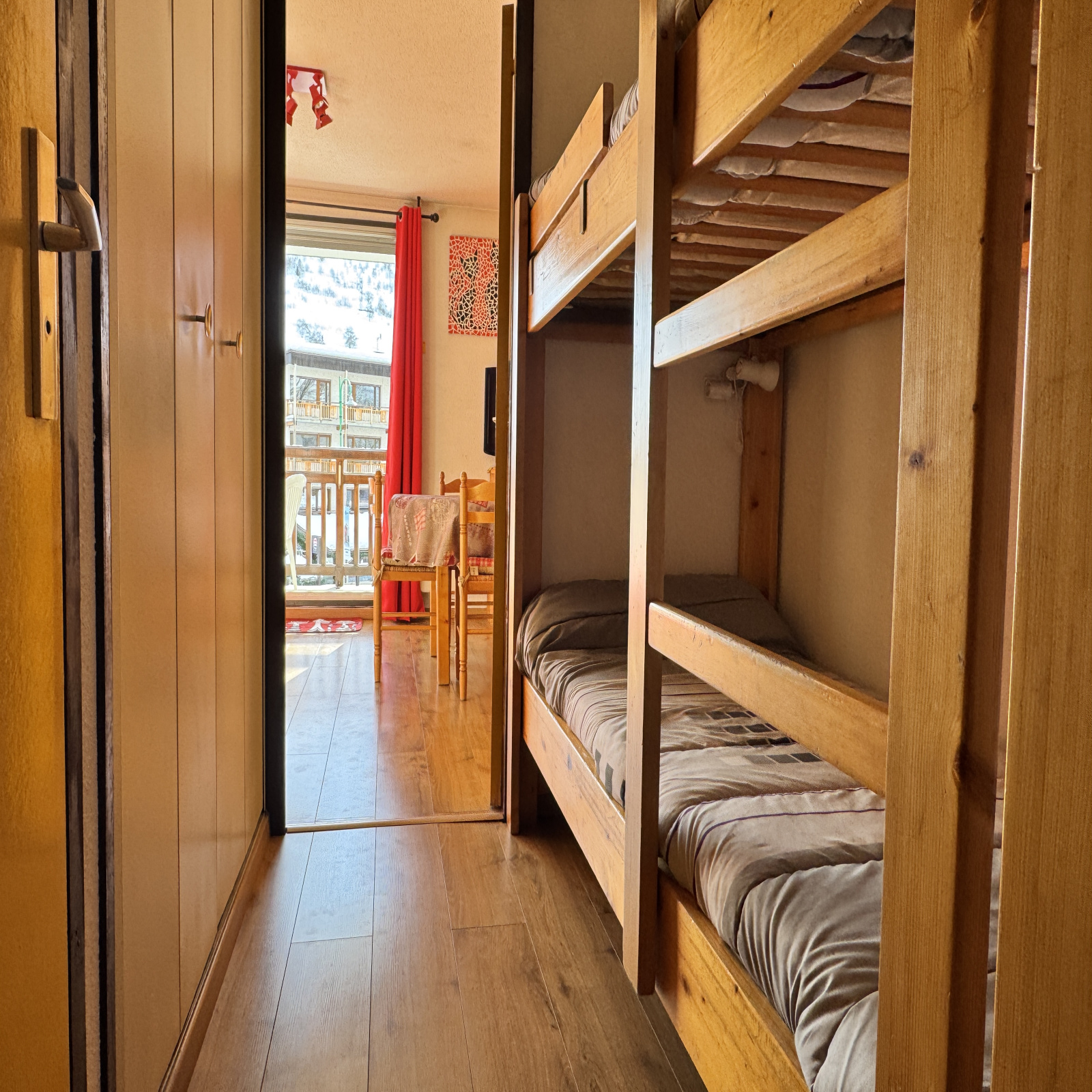 L’agencement est particulièrement fonctionnel pour un studio de cette surface, avec une kitchenette légèrement en retrait du séjour, évitant l’effet “cuisine au milieu de la pièce”, un coin montagne bien identifié, ainsi que des WC séparés de la salle de bains.