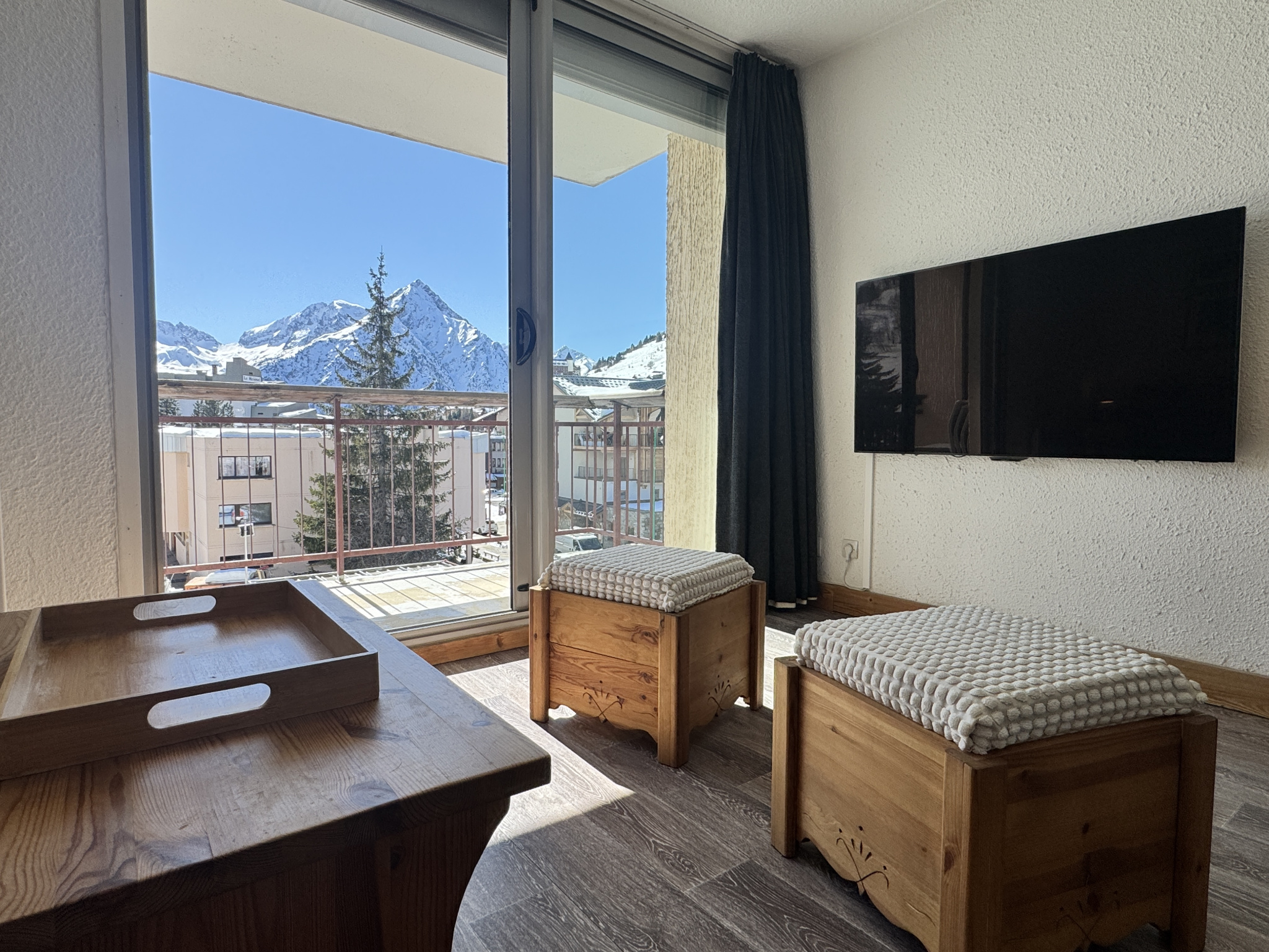Situé au 4ème étage avec ascenseur, l’appartement profite d’une exposition plein sudet d’une vue exceptionnelle sur la Muzelle, les pistes et le front de neige.
